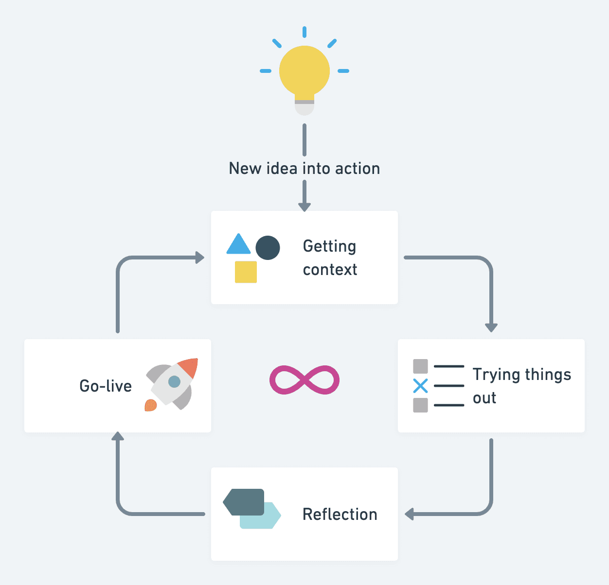 Staying in that cycle helps me to practice my creativity. I don’t always make all the steps in a single cycle. Also, I often swap Reflection with Go live. It happens when I’m excited about something, or I need to do it quickly. Then, I act first and ask the questions later. But that’s OK, there are plenty of cycles to make all the steps the right way.